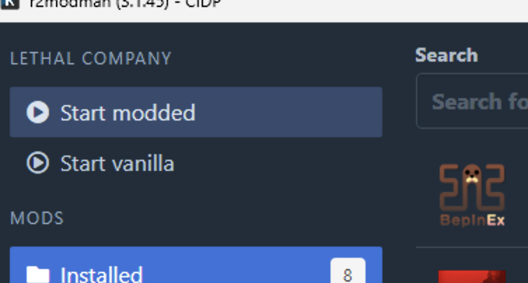 If you did everything right, you should be all set to play Lethal Company with our mods. In front of you you'll see all the mods we're using. In the top left, you can choose to run the modded game. Run it and when it gets to the main menu it should say MODDED at the bottom. This is how you should launch Lethal Company whenever we play.